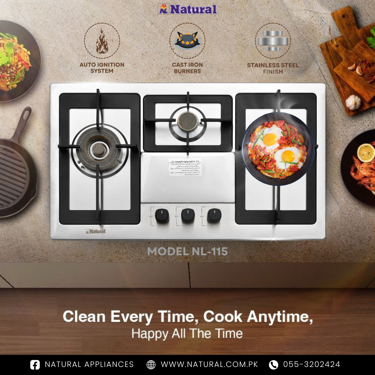 3 Burners Gas Hobs, Brass Burners, Fireproof paint.